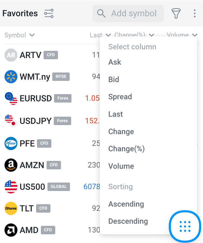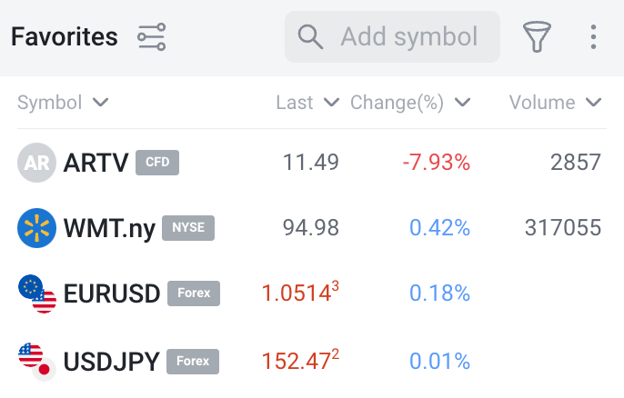 • the "Magnifier" icon opens a search window for all available trading instruments