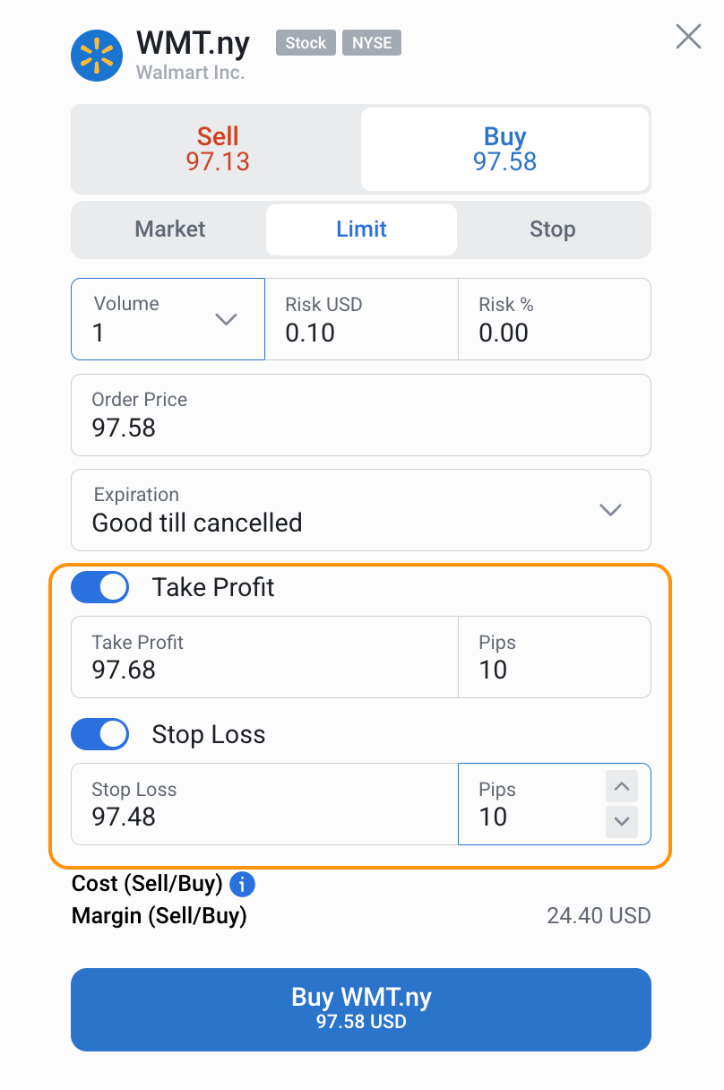 1. You can place pending orders by using the Limit and Stop buttons on the trading panel. In the window that unfolds, choose the type of your order, trading direction, price, and volume.