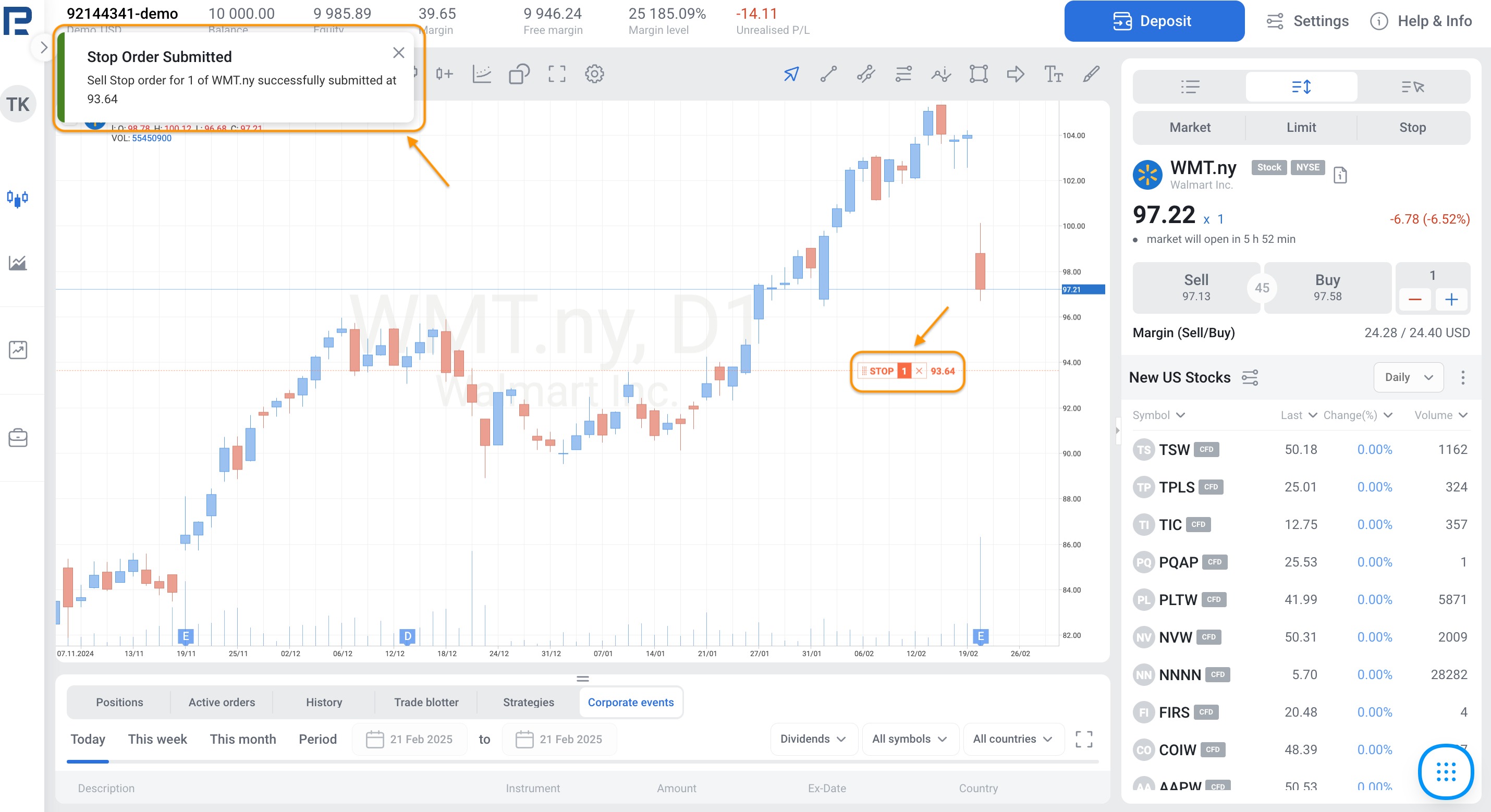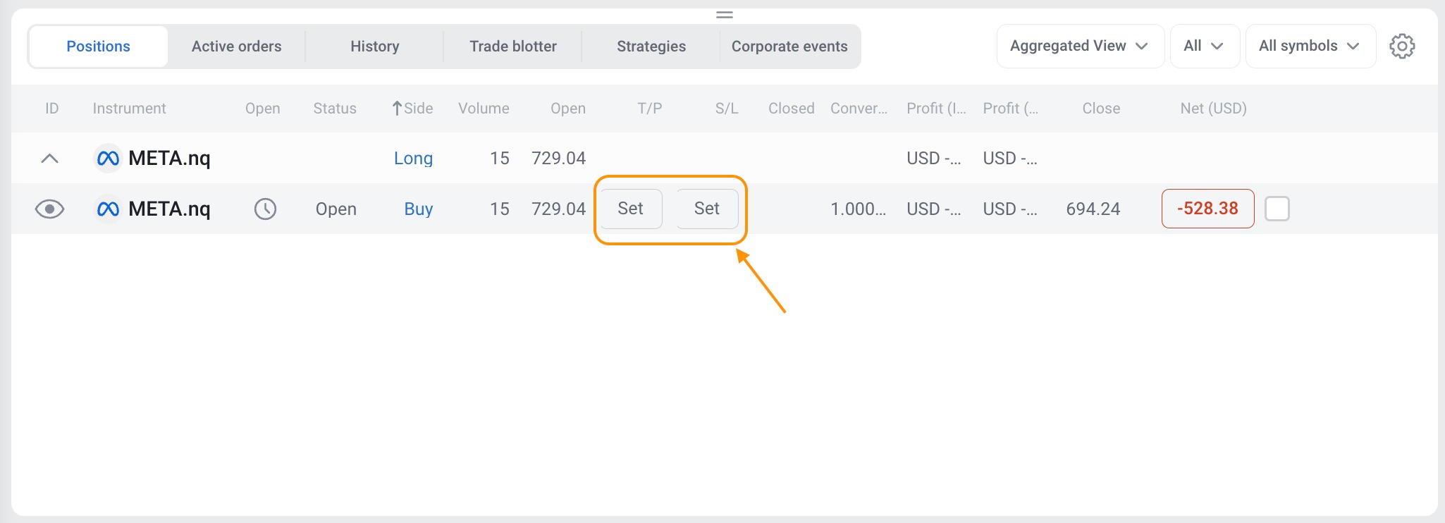 3. Pending closing orders – Stop Loss and Take Profit – can be placed in the trading window from the start, or added later in the current position window in the T/P and S/L columns by the SET button.