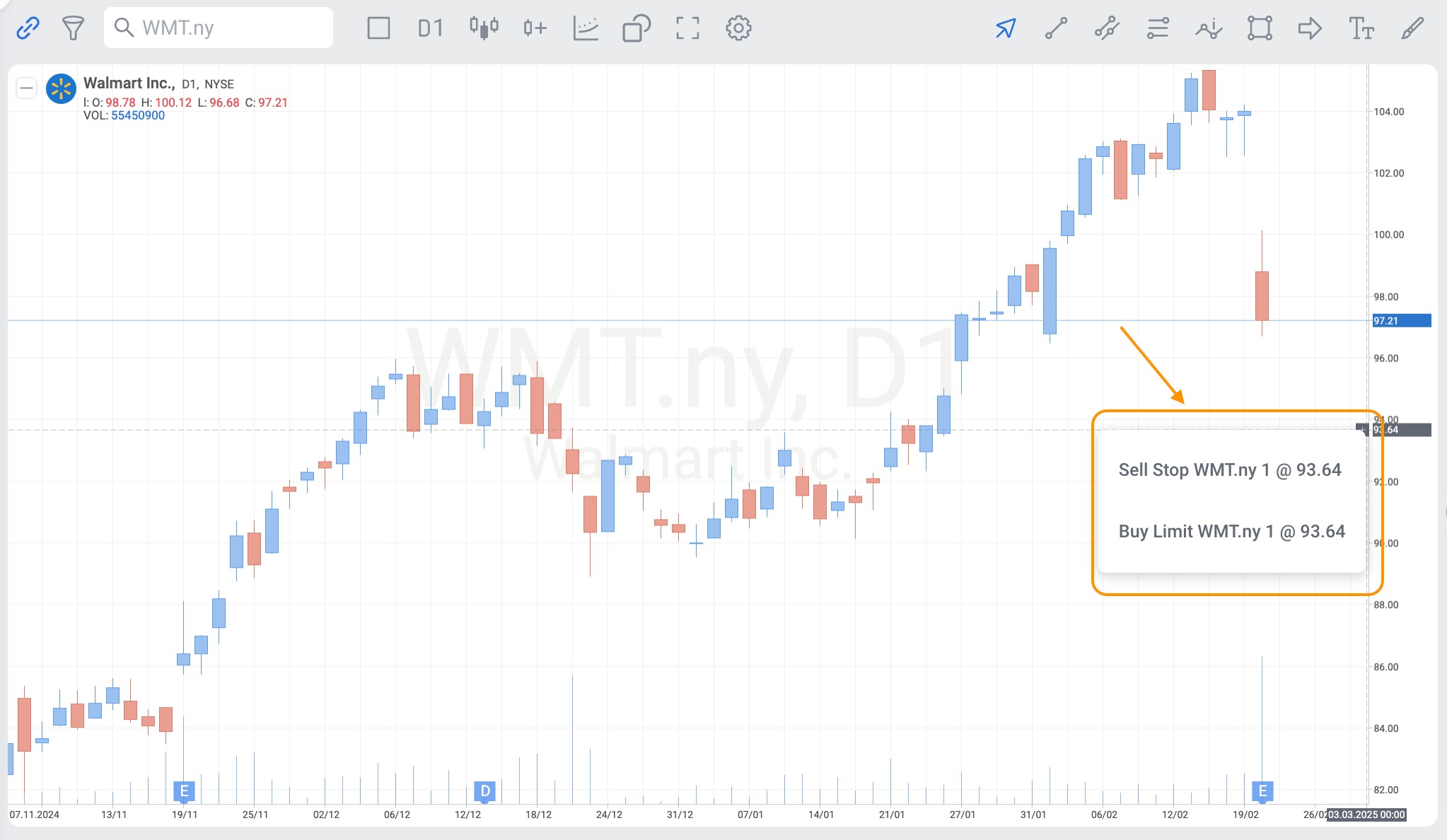 2. An even easier way is put the cursor on the desired quotation on the price scale of the asset and click the "+" symbol that appears. If the quotation is above the current price, the program will suggest Buy Stop and Sell Limit orders to choose from. If the quotation is below the current price, choose between Sell Stop and Buy Limit.