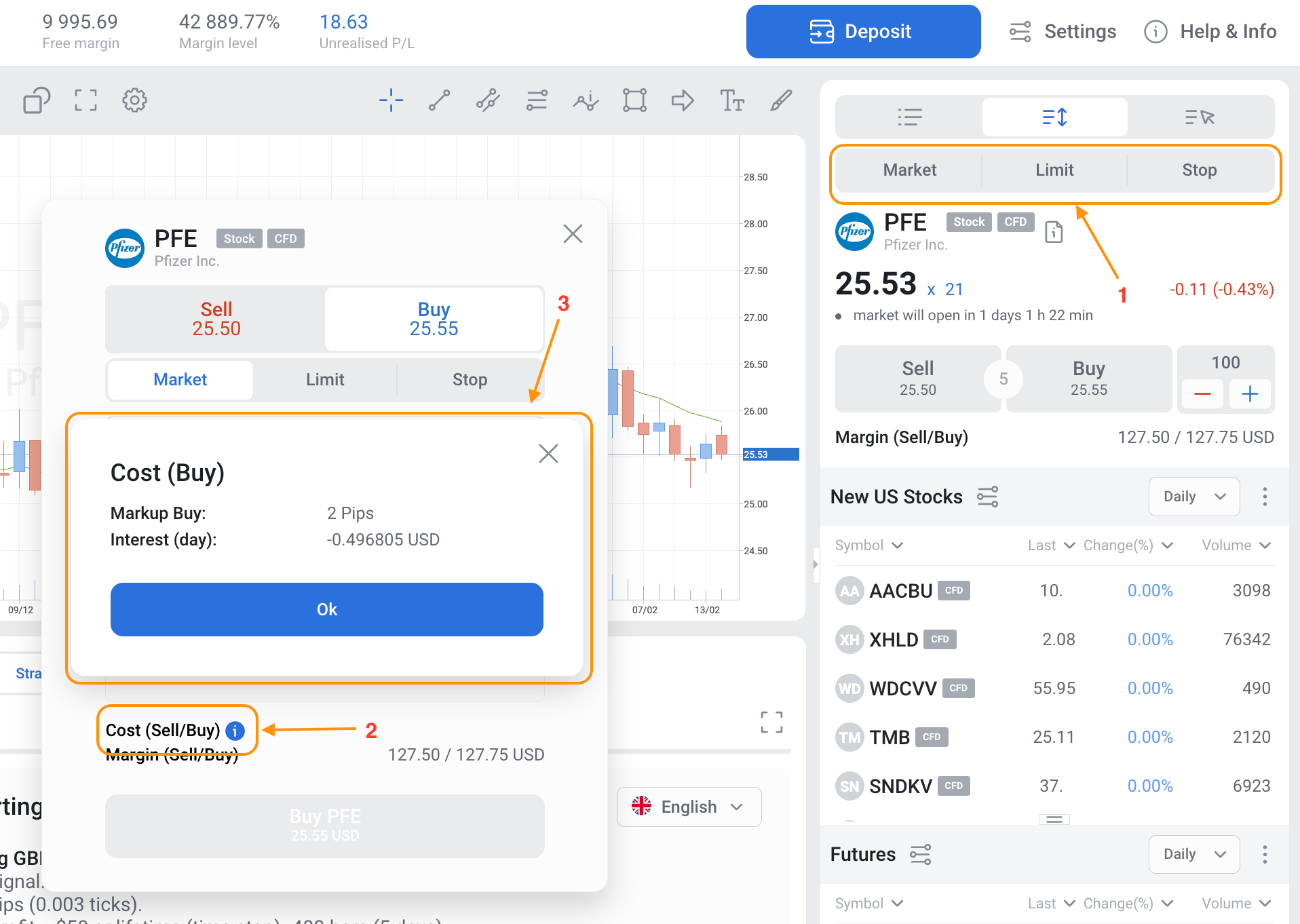In the order form, you can view the cost of a deal based on order volume and price, adjusted for the buy/sell direction and the selected trading instrument. First, open the order form (choose Market, Limit, or Stop options). Clicking on the "i" icon opens an information window displaying calculated parameters based on the selected trading instrument.