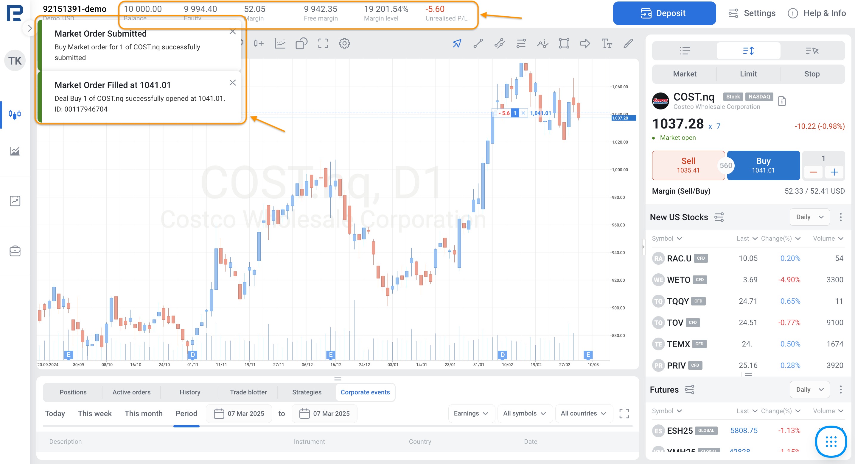 Conditions: The client buys 1 share of COST.nq for $1041.01, with leverage of 1:20.