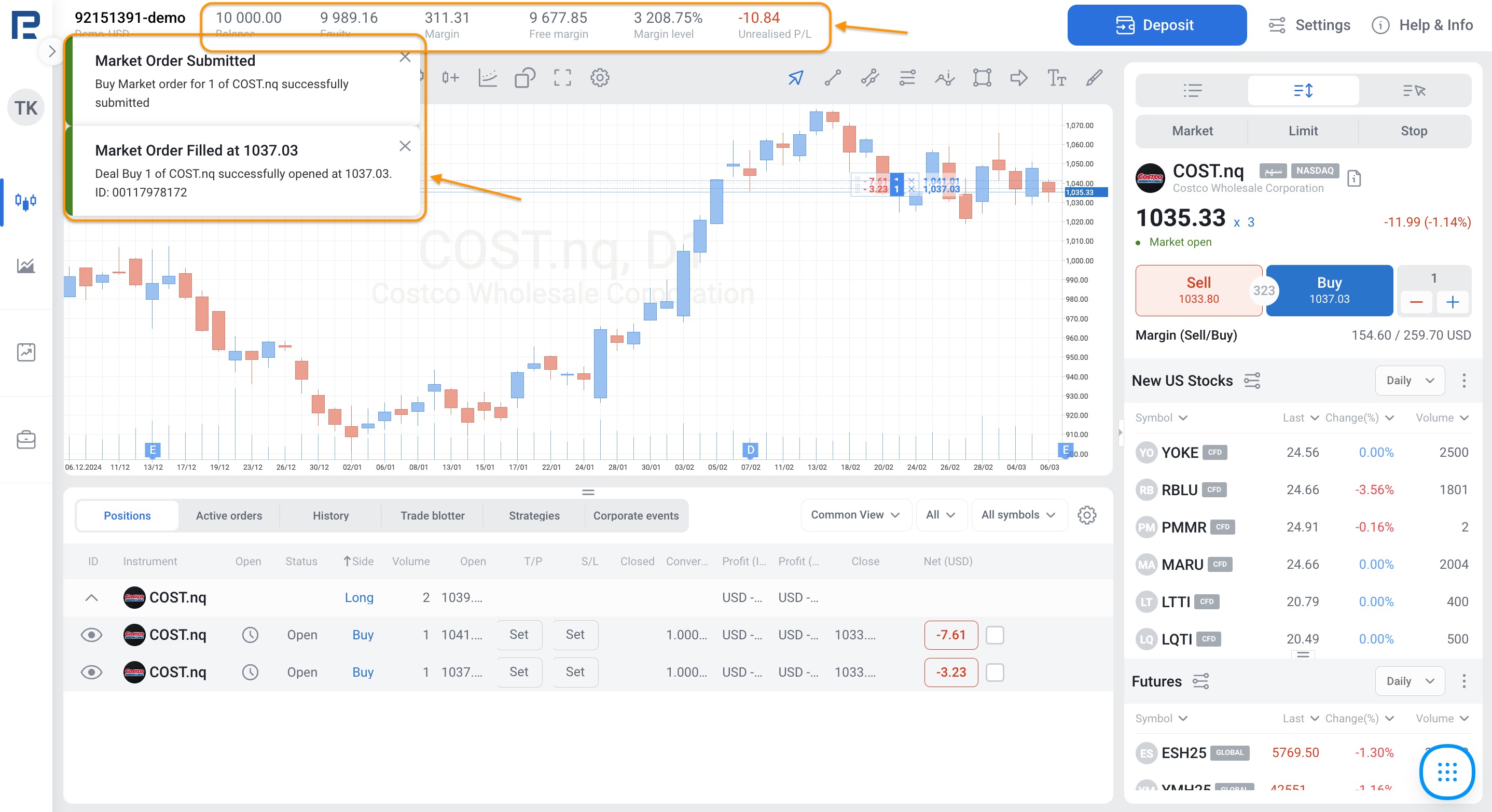 Conditions: COST.nq stock price is $1037.03. The client buys 1 additional share, but leverage has dropped to 1:4 (due to the upcoming COST Earnings the next day).