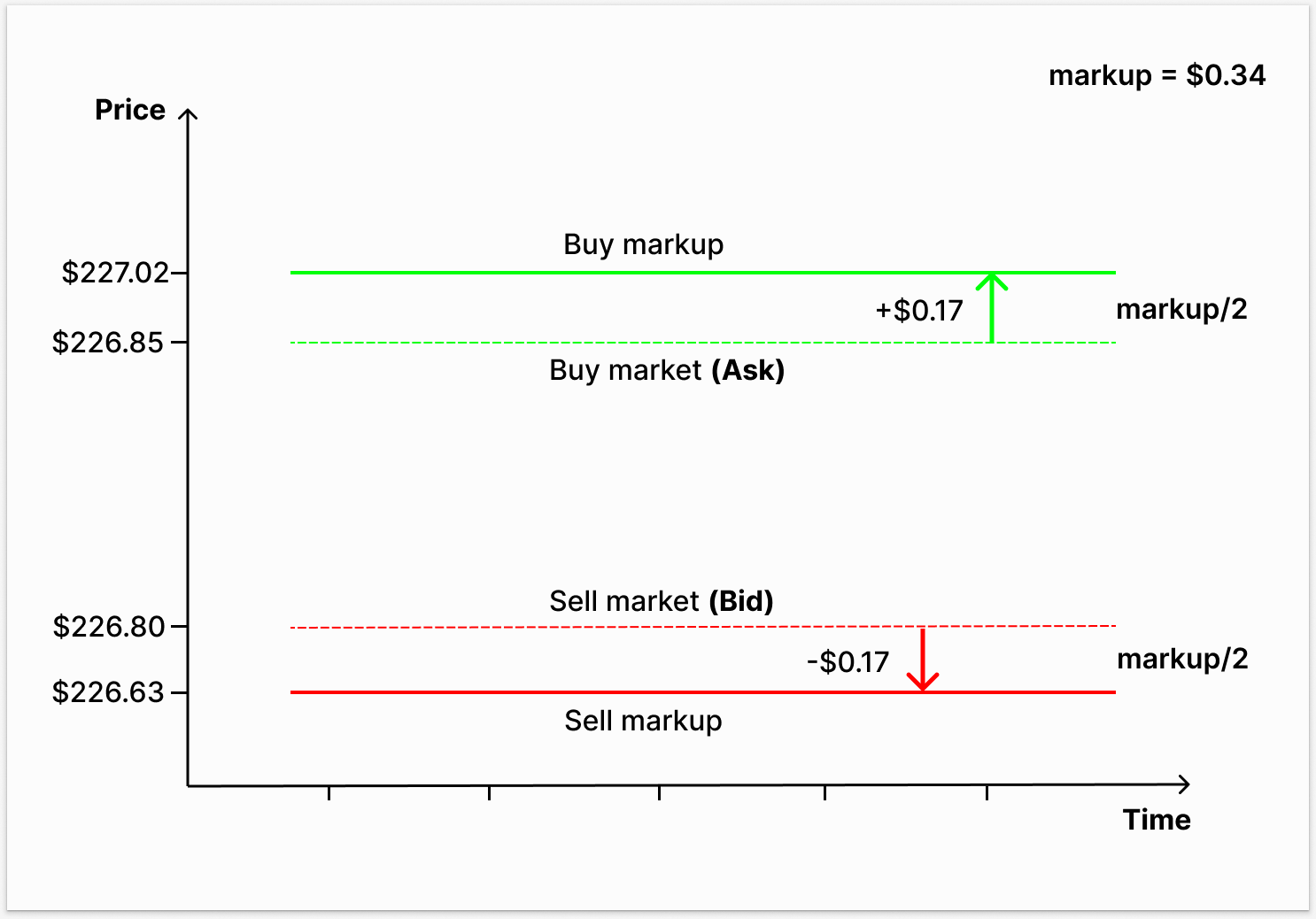 Bid price (for Sell orders with applied markup) = 226.80 - 0.34/2 = 226.63