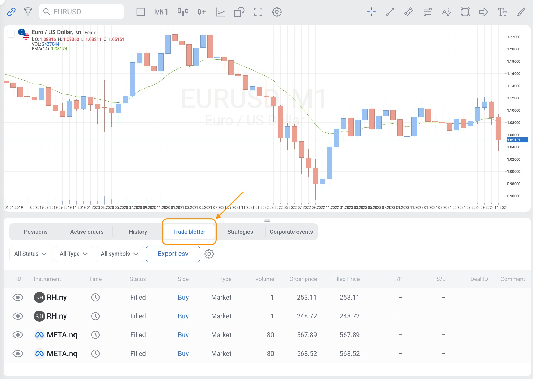 7. Find all "filled", "cancelled" and "rejected" orders in the Trade Blotter tab in the account summary on the trading platform.