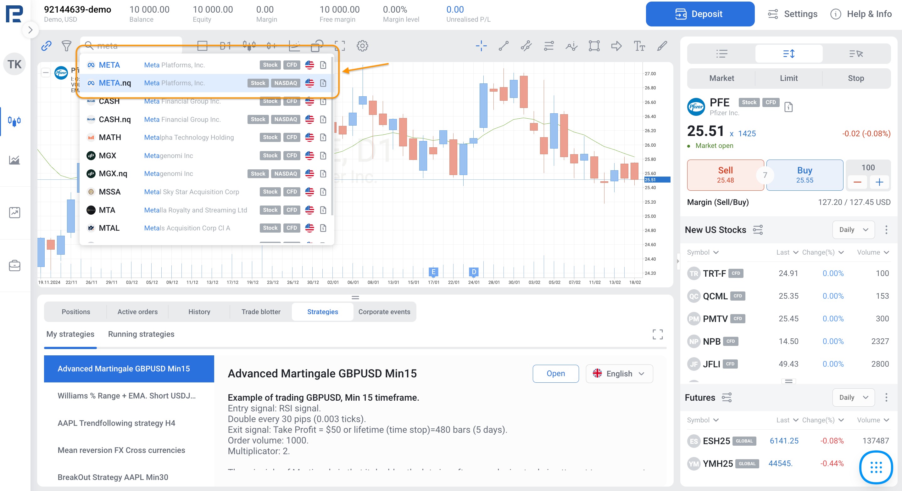 You need to open the chart of your required instrument via Search Instrument, and introduce its ticker or select it from the list – for example, (ticker META) for Facebook stocks. The next step is to choose to buy either stock or CFD on stock.