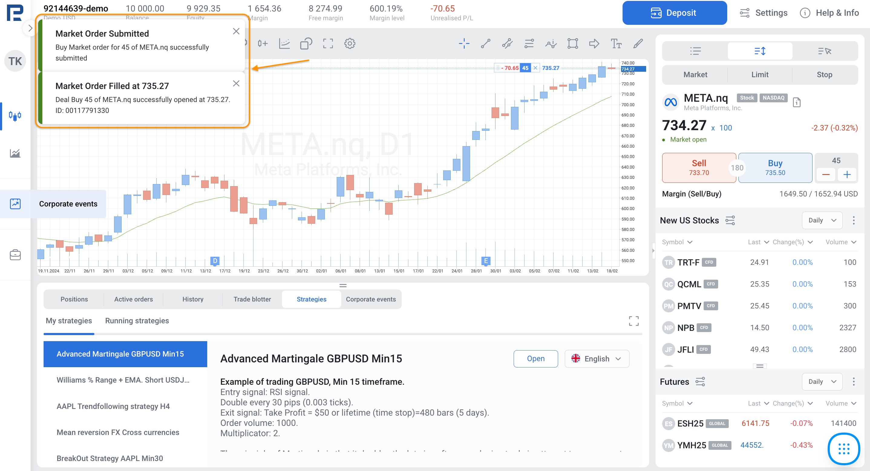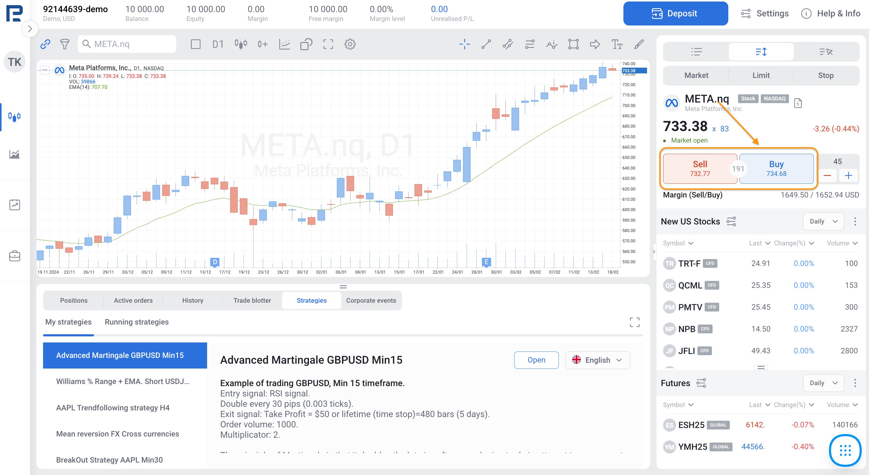 You can view the trading window and the customisable list of instruments, which is positioned on the right of the price chart. In the first one, there is the current selling price named SELL, the current buying price named BUY, the number of stocks and the margin. You can purchase some stocks at the current price, or put a LIMIT or STOP order and buy at a later stage at your preferred price.