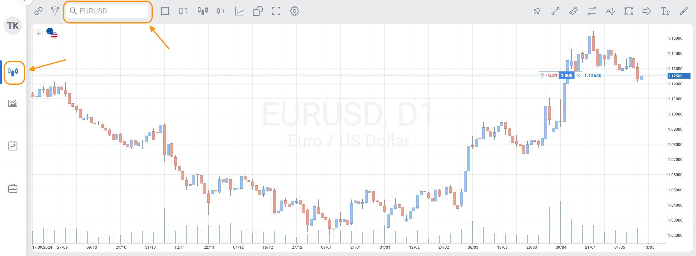 To access the list of tradable instruments using web version of the platform, log in to your account and open "Trading" tab. You will see the search field and a magnifying glass icon above the chart on the left, click the icon.