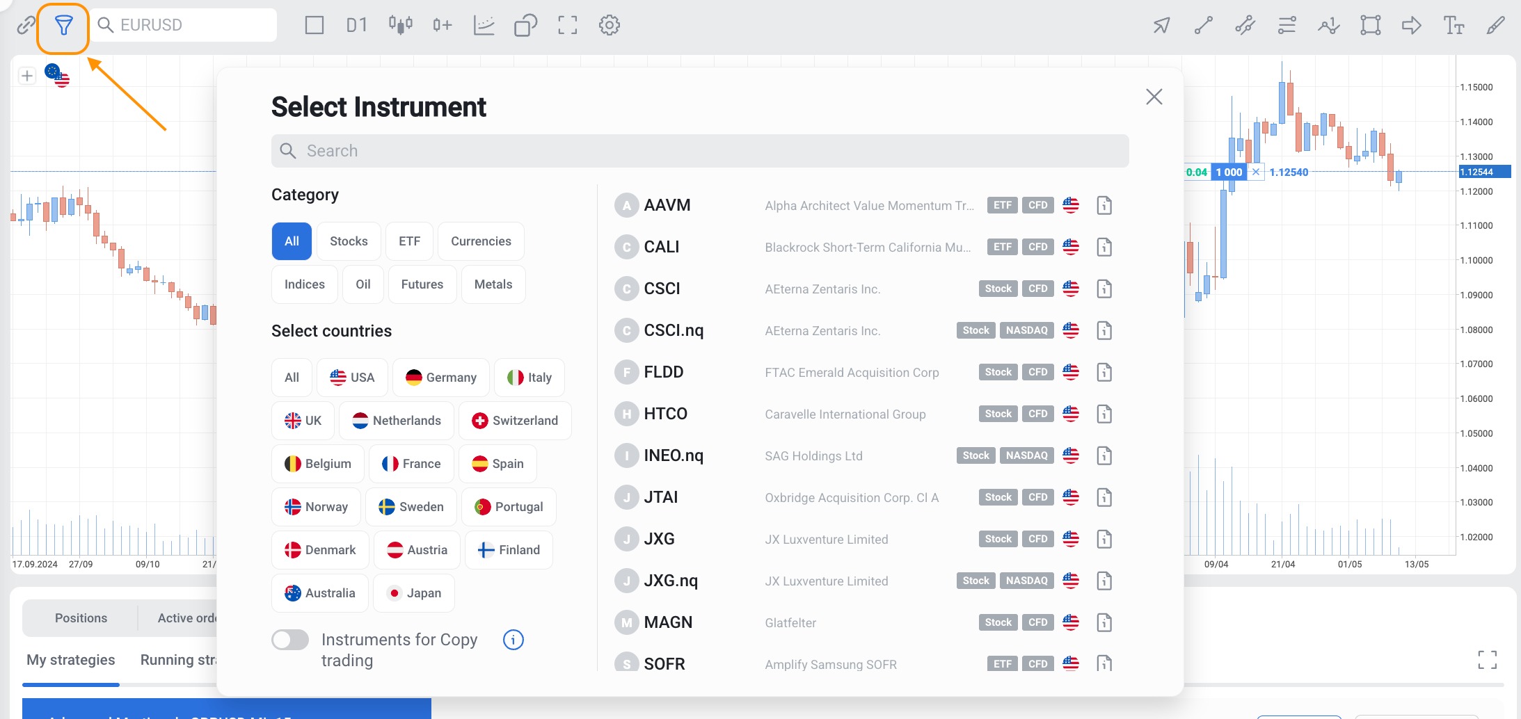 Alternatively, click the funnel icon to the left of the search field to filter instruments by category and country.