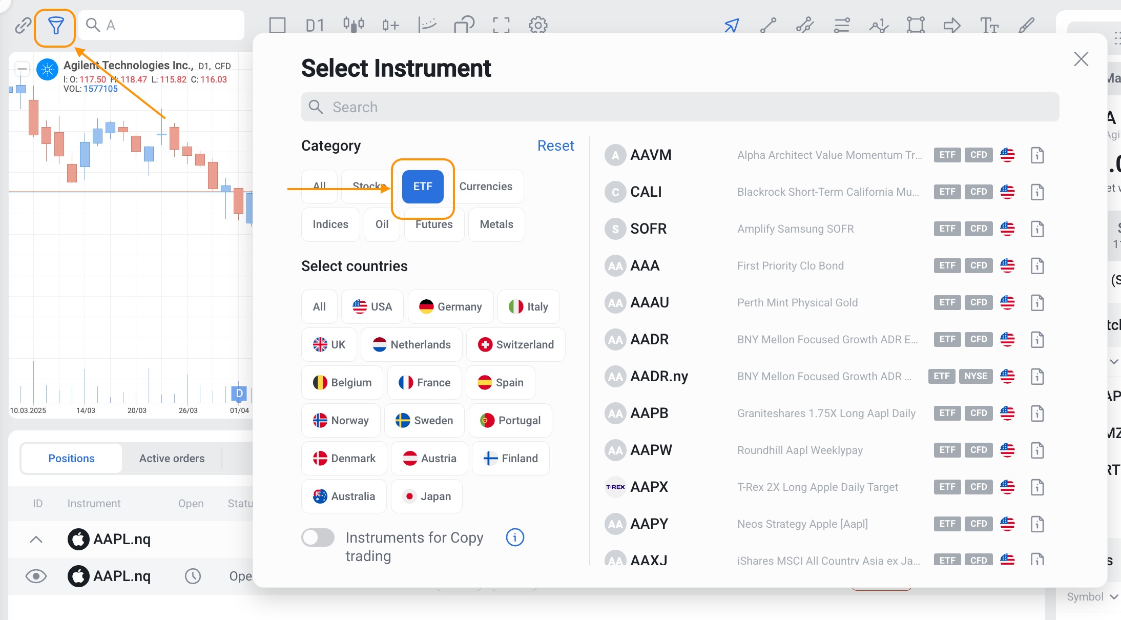 You can also access contract specifications using the search function on the web platform. It is marked with a magnifying glass icon. You can filter the instruments by countries and type.