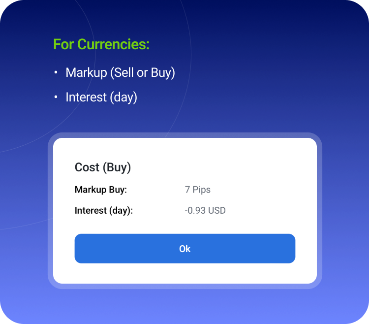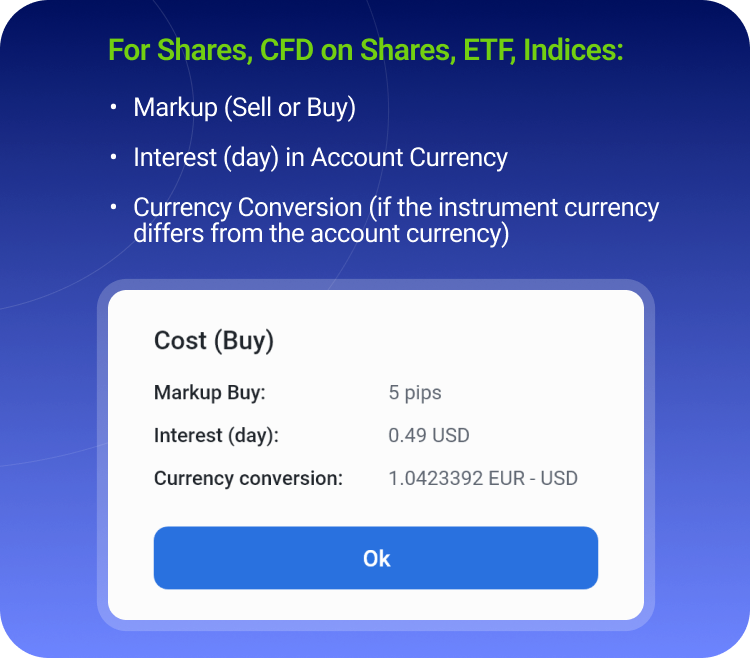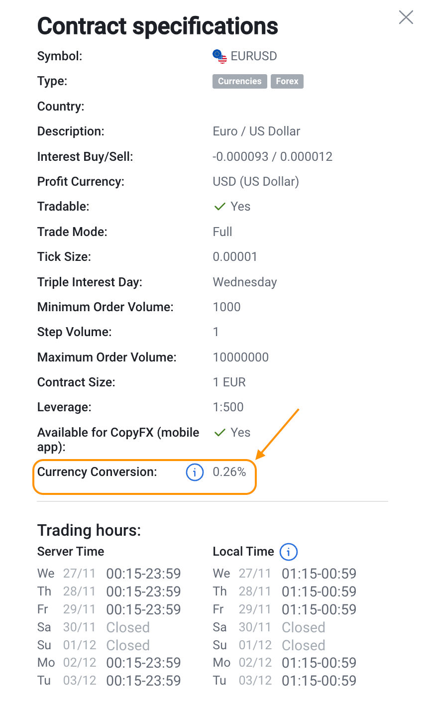 Markups are applied to conversion rates in case the funds engaged in trading Stocks, ETFs, and CFDs need to be converted. View the markup values used for the funds conversion for each currency pair in the "Contract specifications" section.