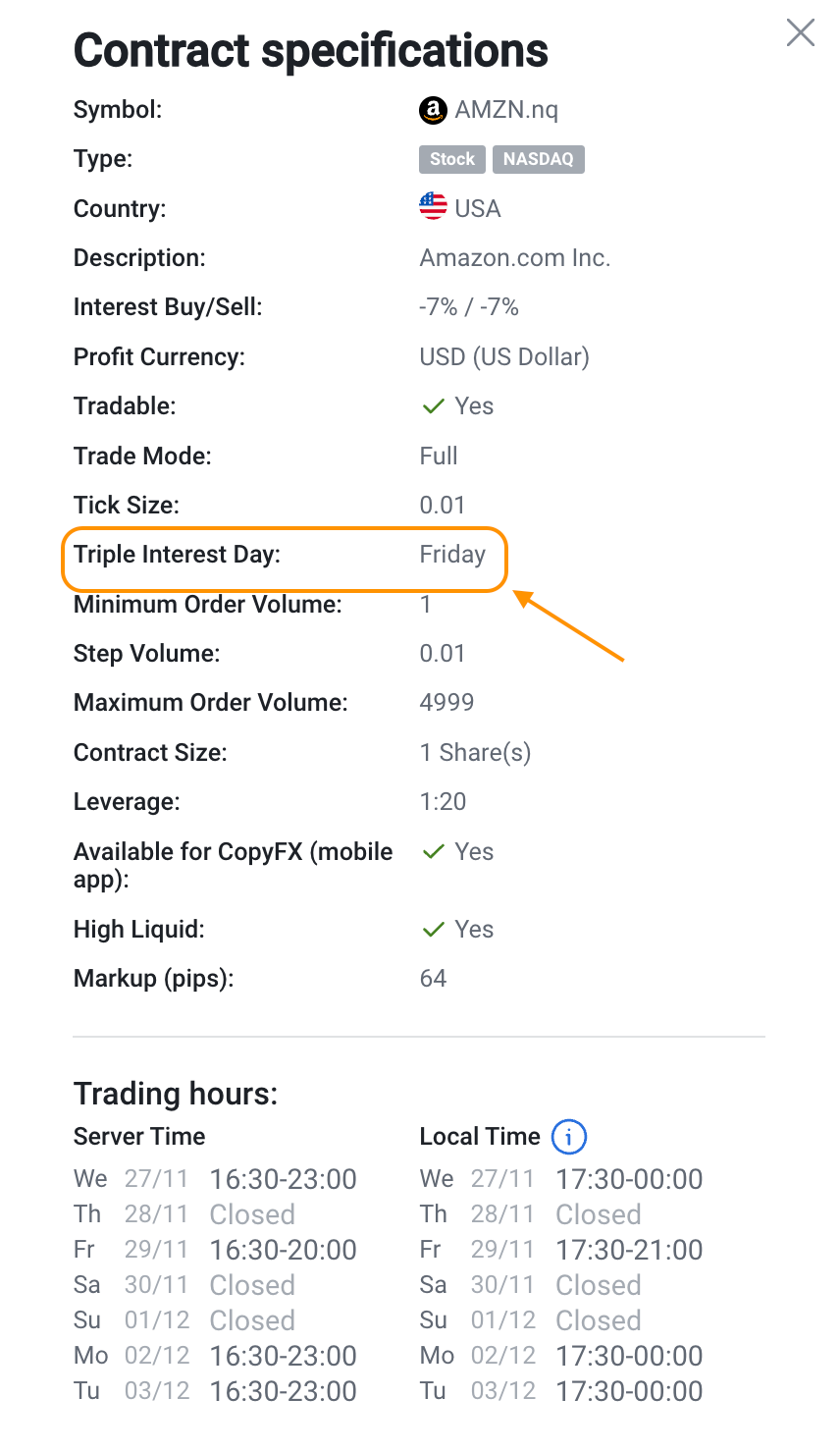Triple interests are applied to some instruments on a specific day of the week. Find the triple interest day for each instrument in the "Contract specifications" section.