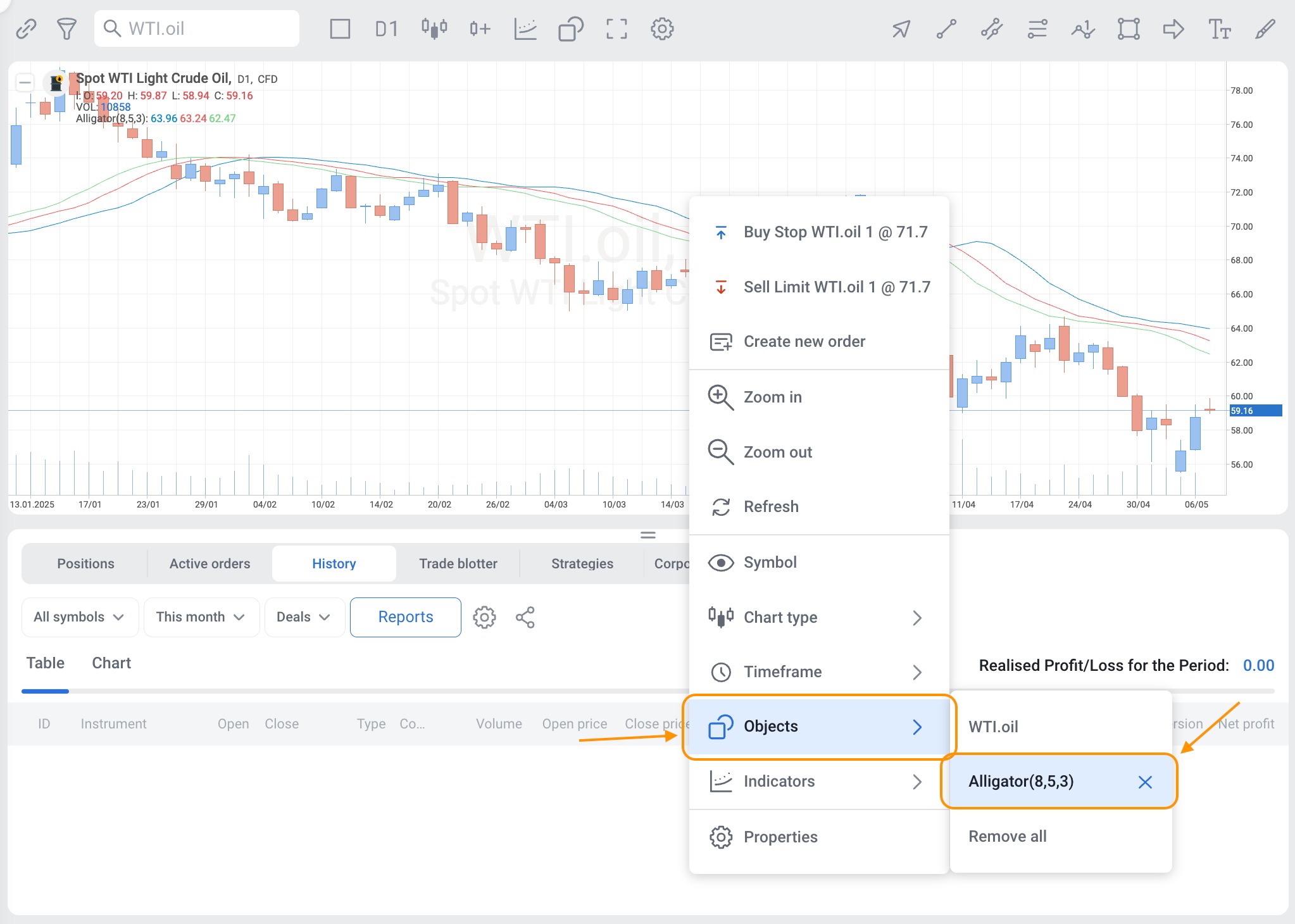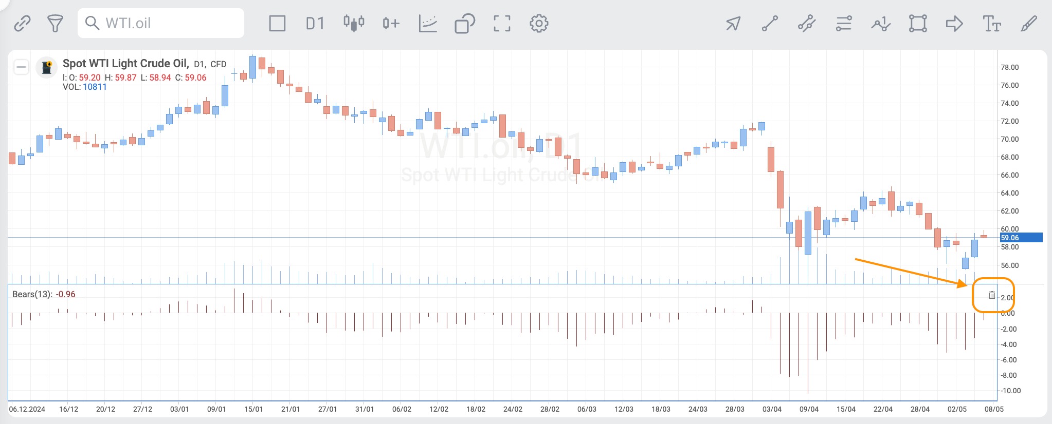 Alternatively, right-click on the chart, go to "Objects" section of the menu, click the X icon to remove the indicator.