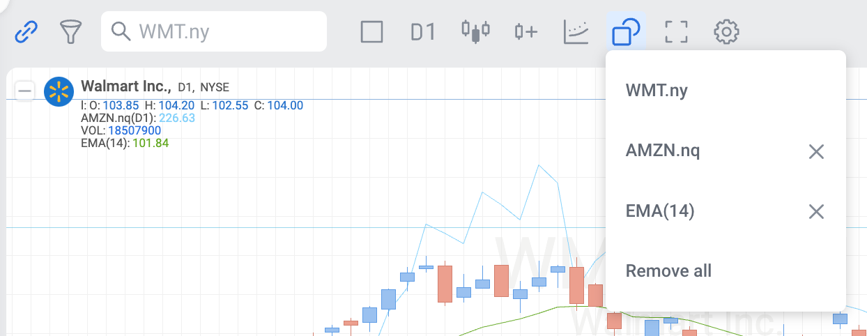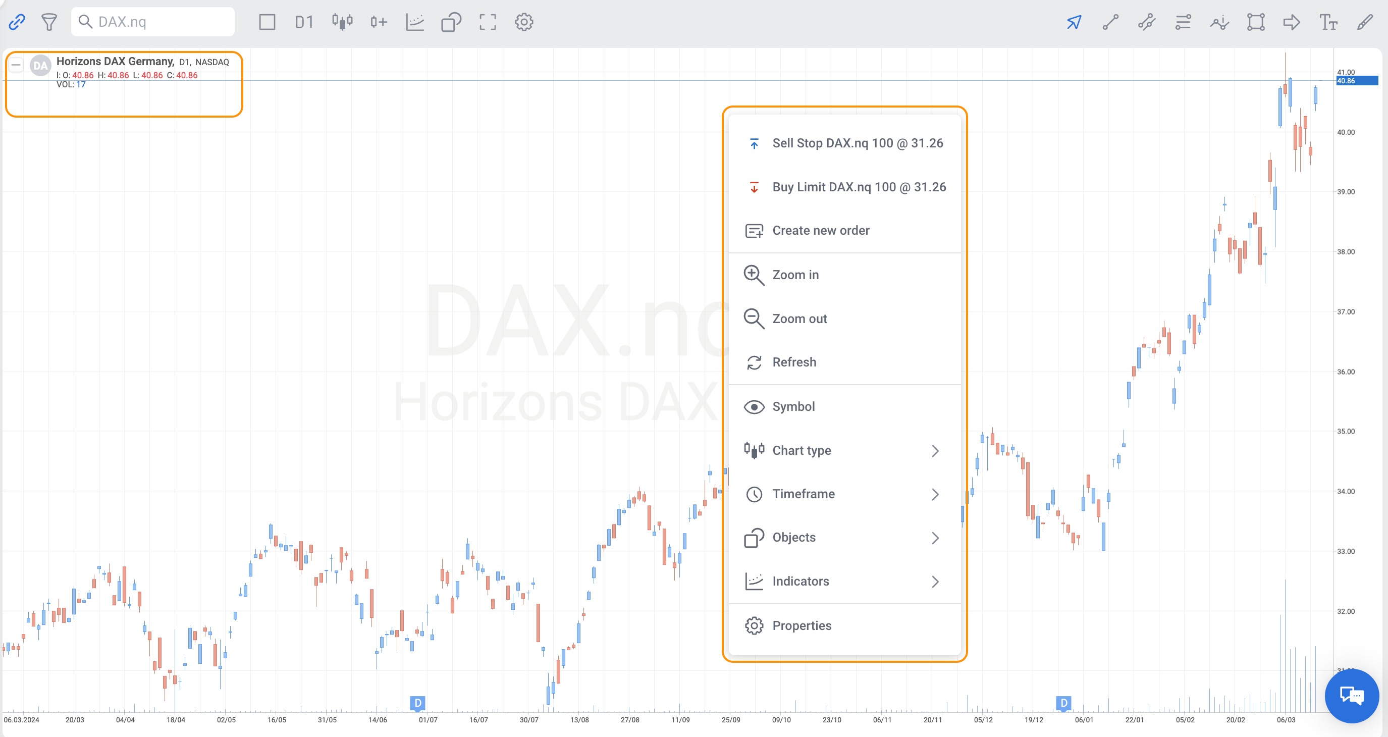 Also, in the upper left corner of the chart, there is a small square. Click it to expand/fold-in price parameters (open, high, low, close) and indicator values. Right-click on the chart in any place to open a window with functions from the upper board.