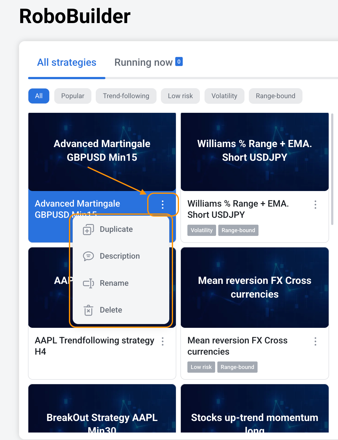 Go to All strategies and find three vertical dots on the right side of the strategy name. Click on the dots to view the following options: