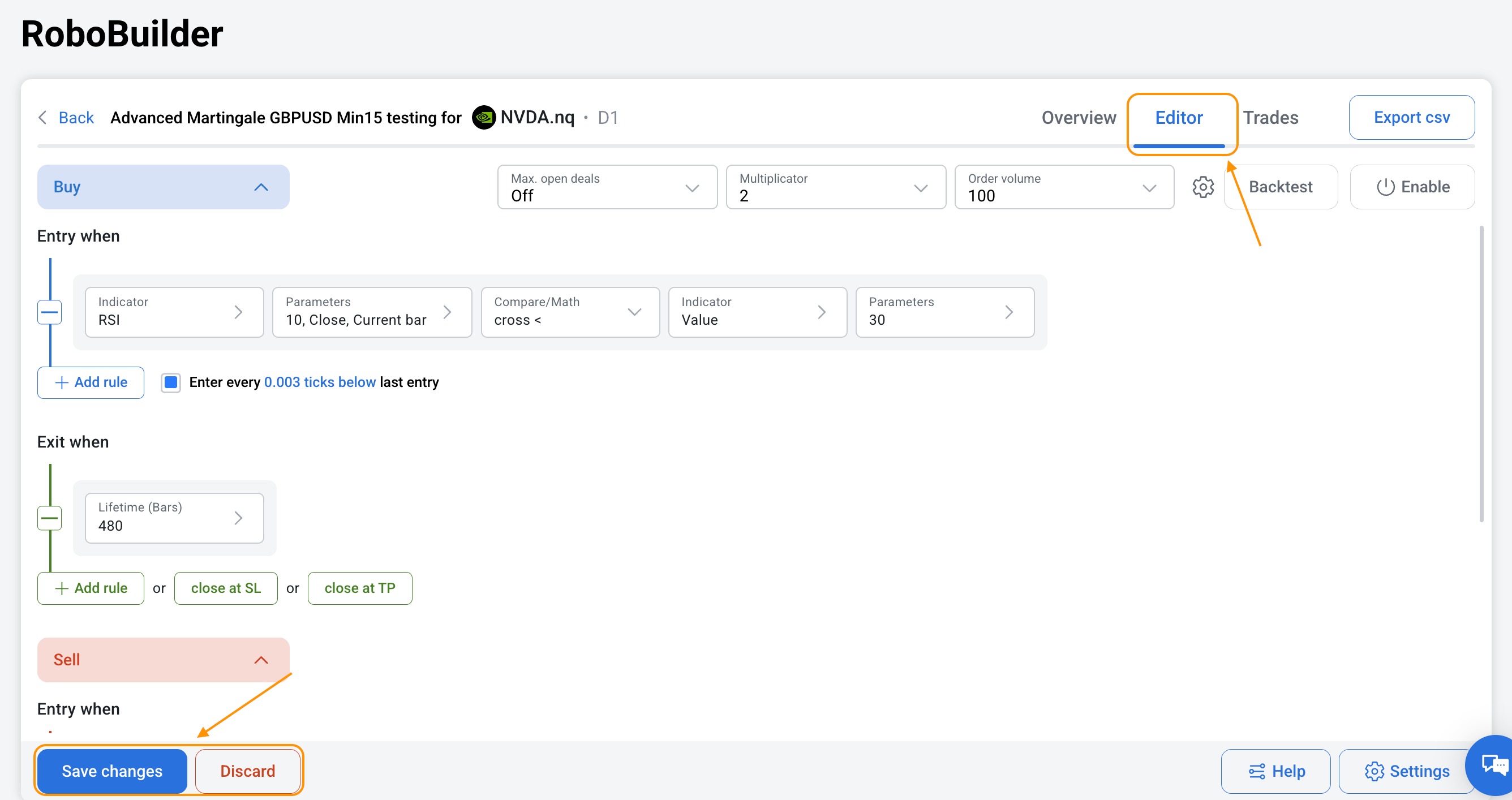 Editor tab has two buttons in the right bottom corner: Discard and Save changes.
