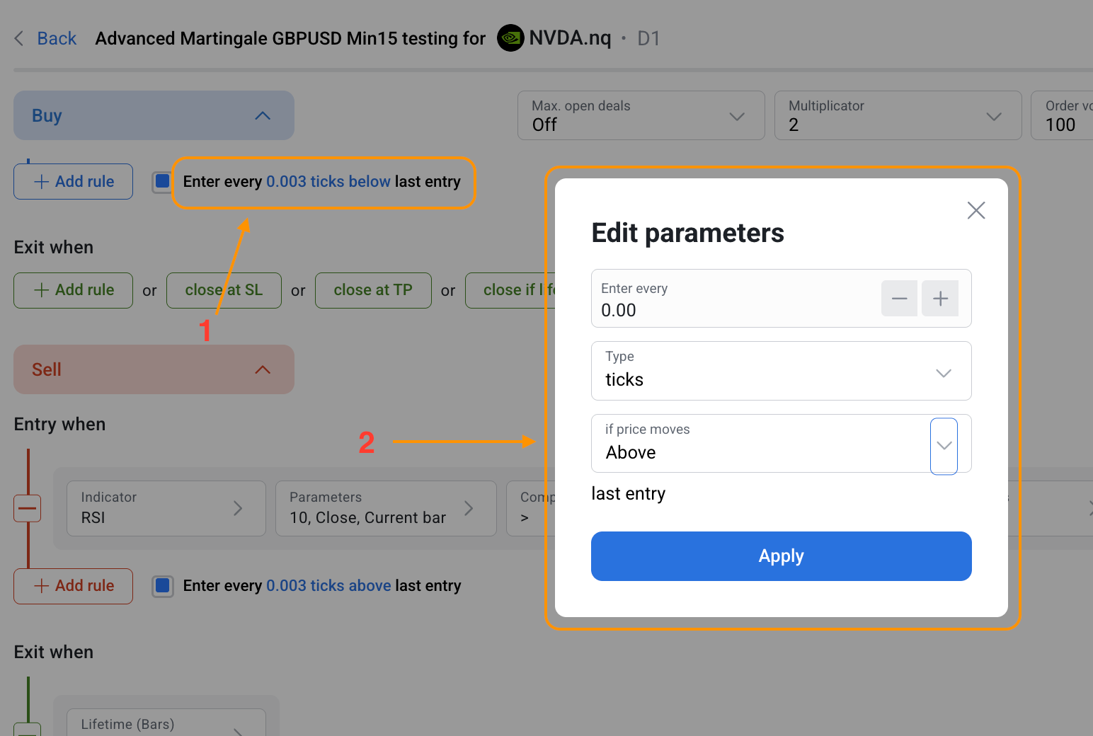 Last open deal price = 100.95 and entering conditions: buy every 1.00 ticks below last entry.