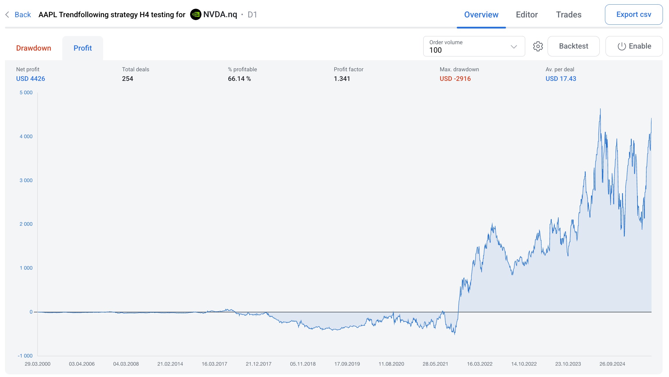 Button EXPORT CSV allows to export backtest results into CSV file.