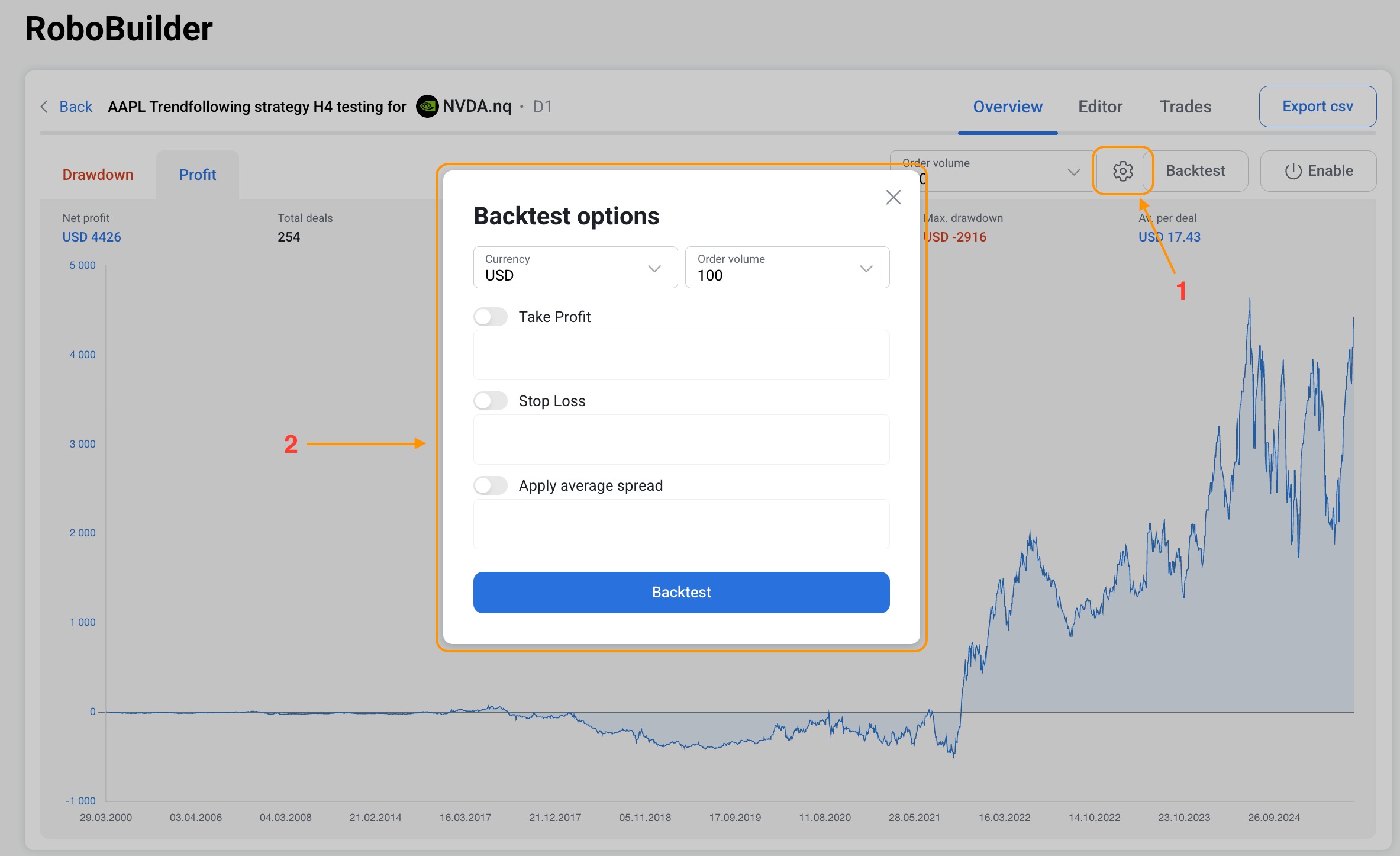 Currency: Available currencies for Backtest. All results in Overview and Trades will be indicated in selected currency.