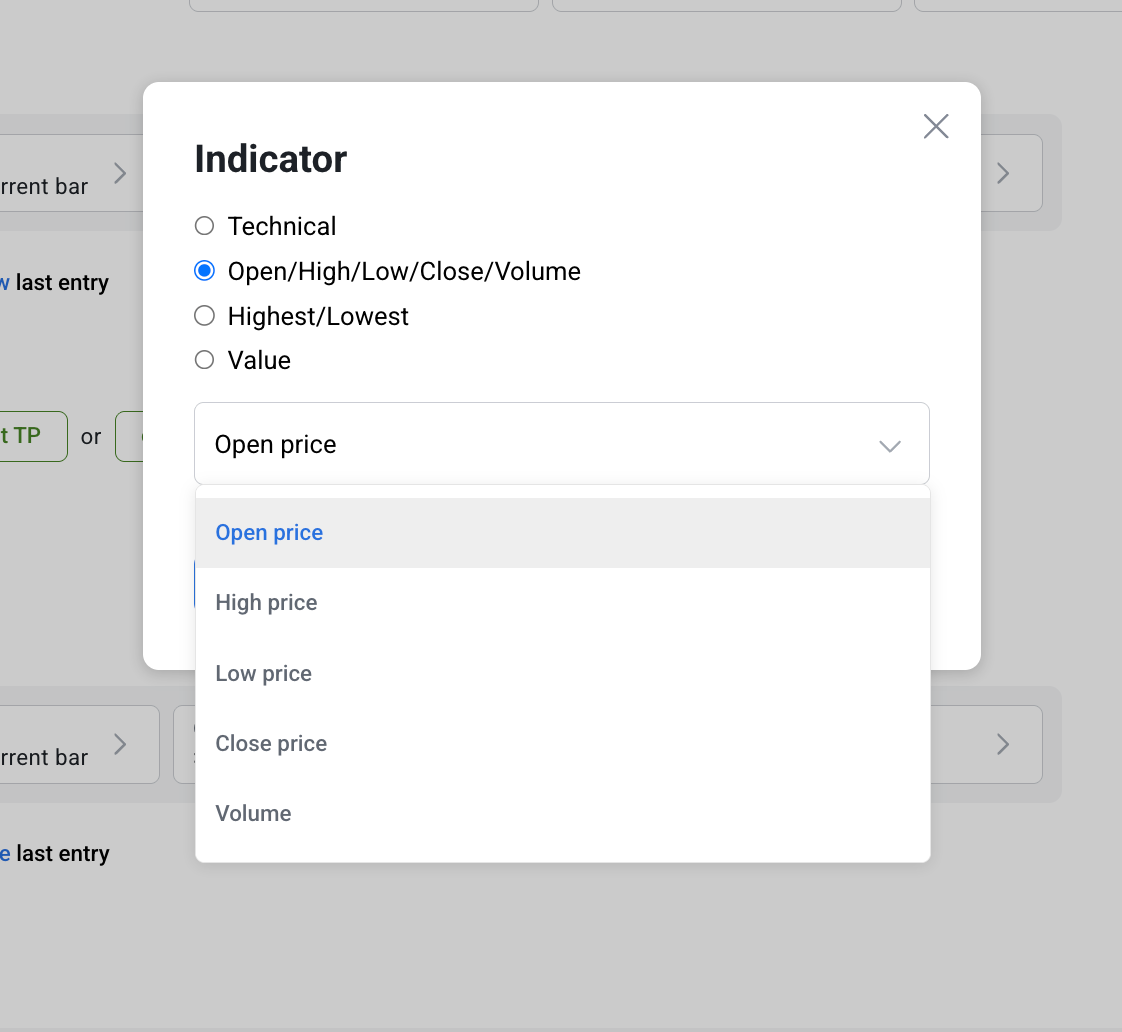 This indicator doesn’t have any parameters and stands for current bar open price, high price, low price, close price and volume.