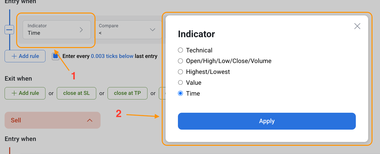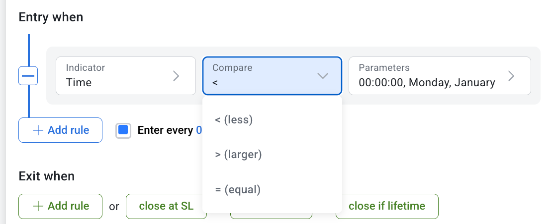 This indicator limits trading operations to certain time therefore it has only three available comparisons:
