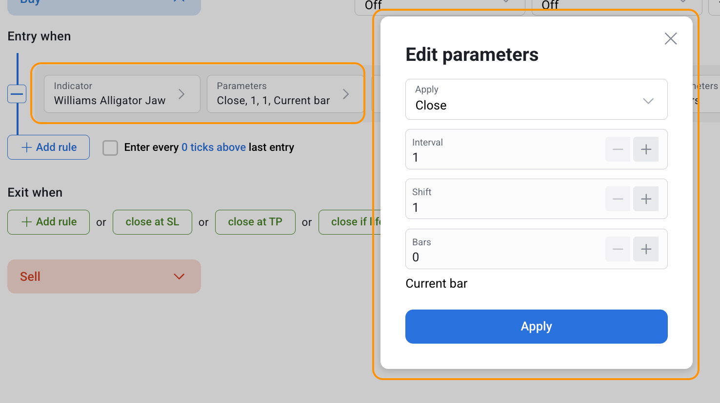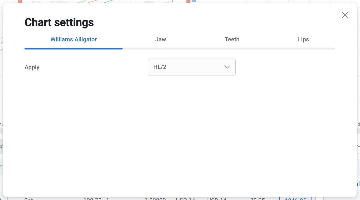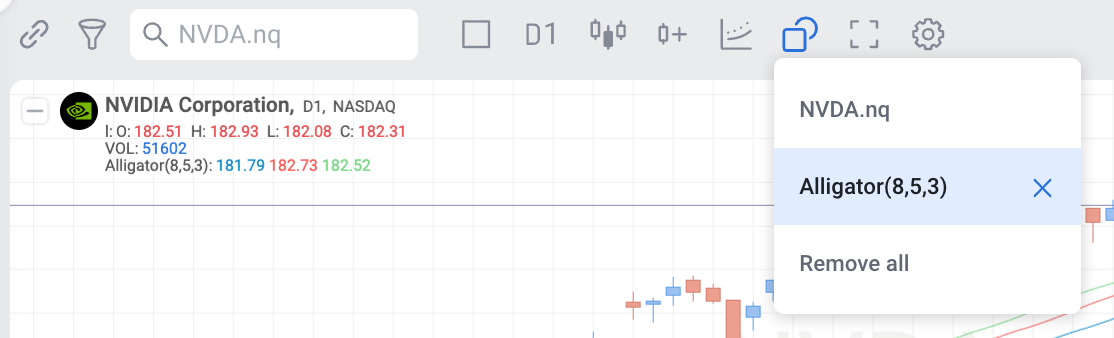 Since the Williams Alligator indicator consists of three separate components (Alligator Jaw, Alligator Teeth, Alligator Lips) each of which has its own parameters and values, in RoboBuilder the Williams Alligator is also divided into three indicators: