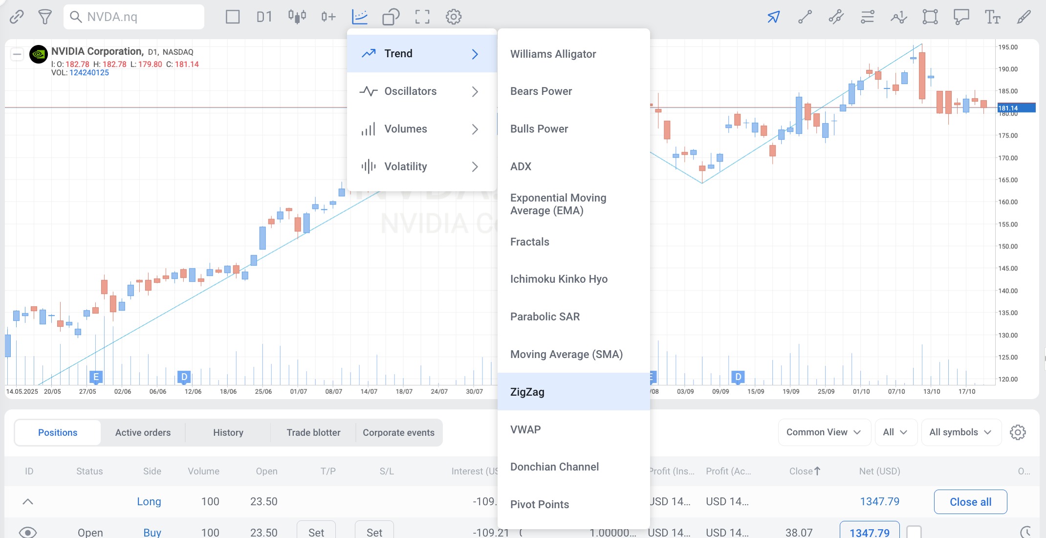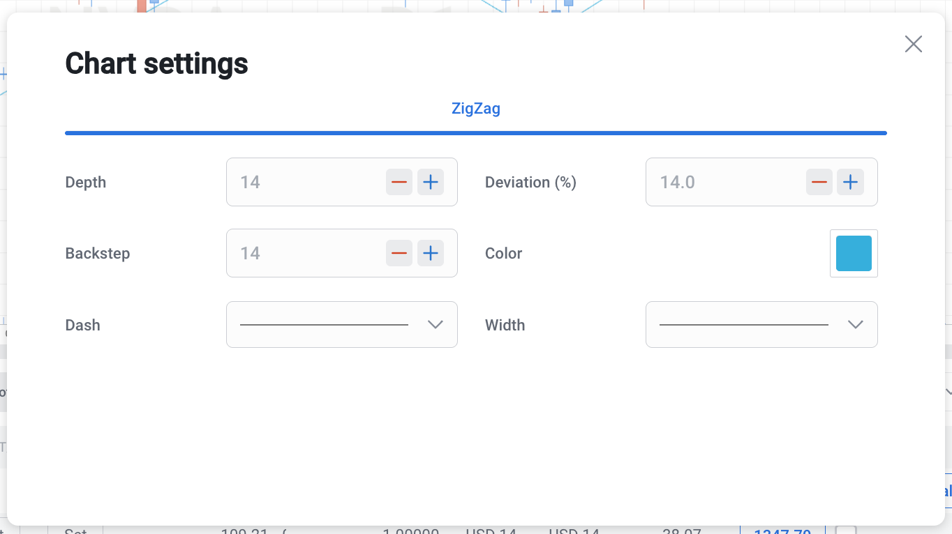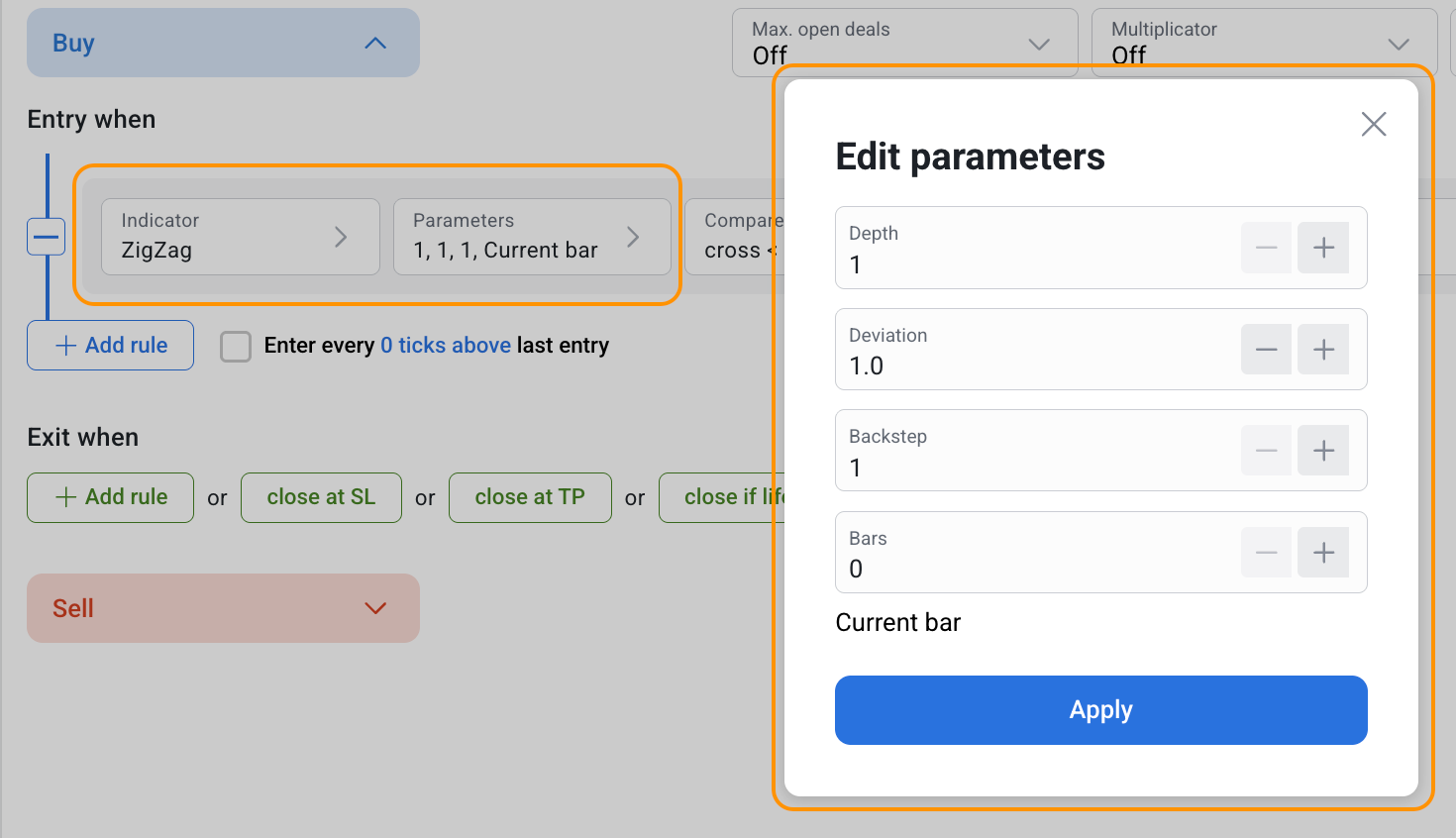 ZigZag can be used both separately and together with other indicators in the RoboBuilder.
