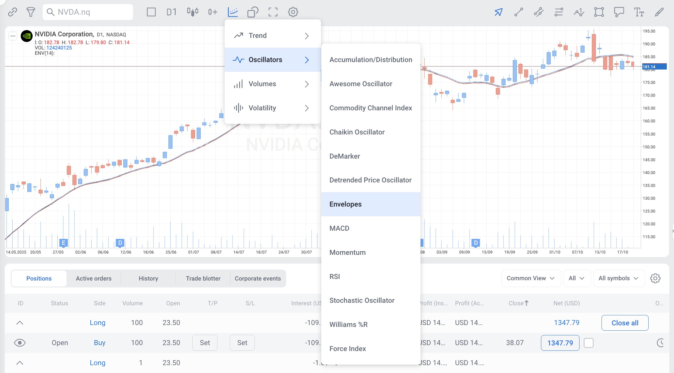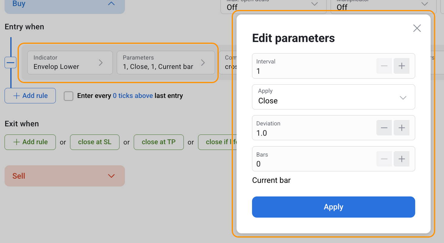 Since the Envelopes indicator consists of two separate components (Envelope Lower, Envelope Upper) each of which has its own parameters and values, in RoboBuilder the Alligator is also divided into two indicators:
