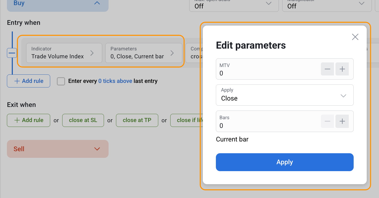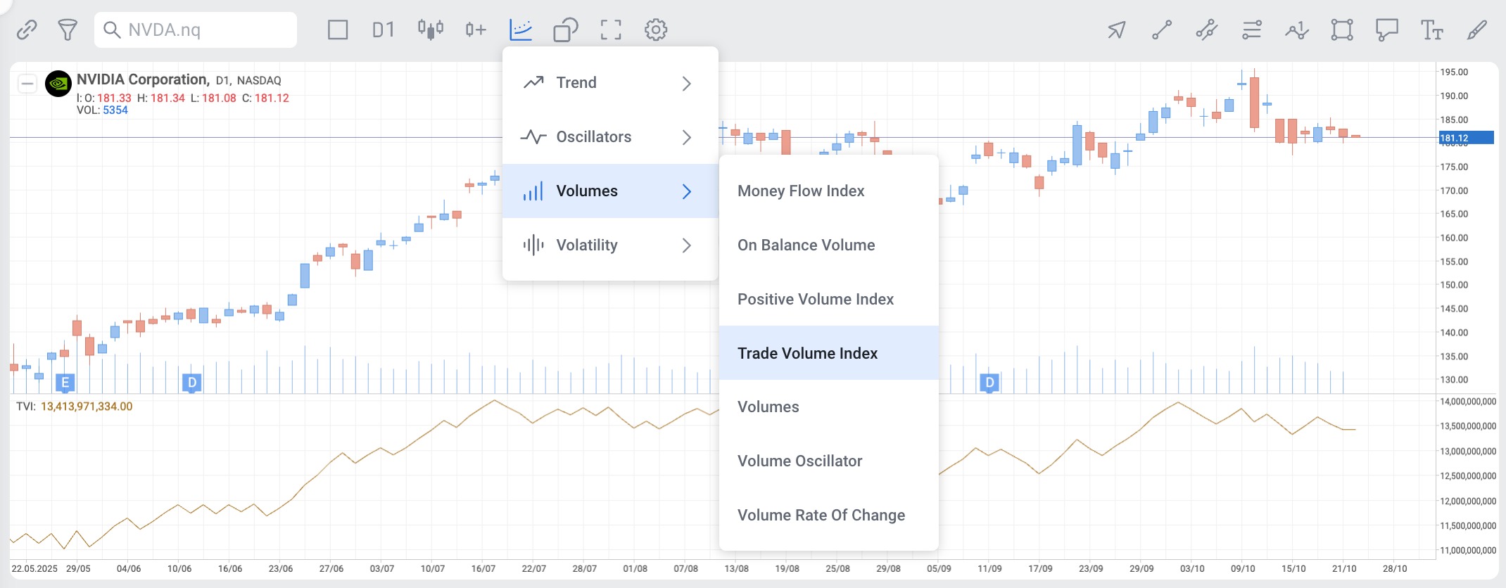 Trade Volume Index can be used both separately and together with other indicators in the RoboBuilder.