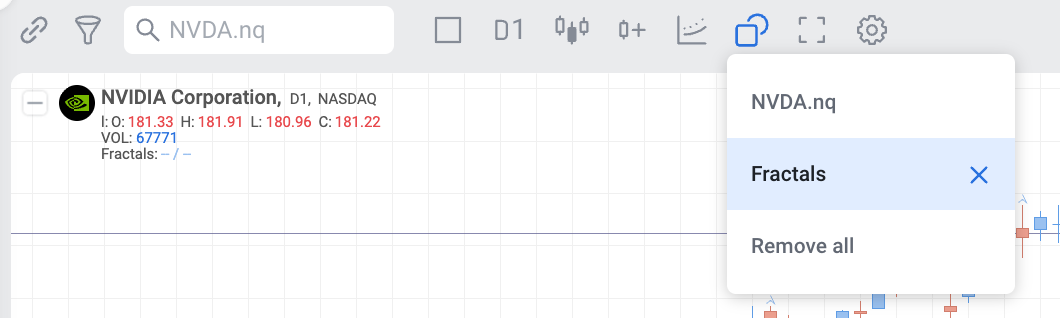 • A bearish fractal occurs when there is a high point with two lower high bars/candles on each side of it.