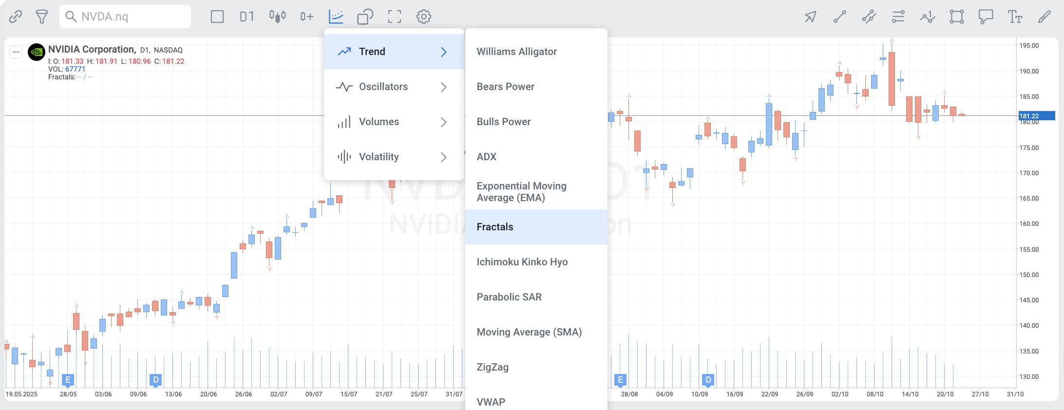 • An up arrow marks the location of a bearish fractal, while a down arrow marks the location of a bullish fractal.